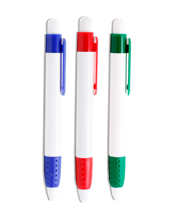 Bolígrafo plástico retráctil. Tinta negra. Grip de goma.